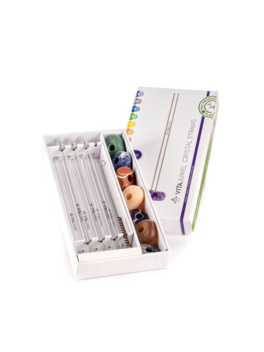 Crystal Vibes für dein Lieblingsgetränk! Bring deine Drinks in Schwingung mit den handverlesenen Edelsteinen der VitaJuwel Crystal Straws. Das ALL7 Set enthält sieben stabile Glastrinkhalme und naturbelassene Edelsteine in den Farben des Regenbogens.